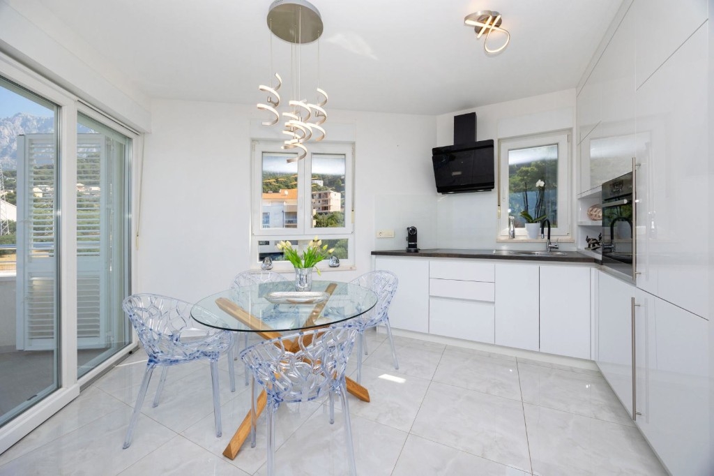 Prodaje se atraktivan, potpuno namješten dvosoban stan bruto površine 70 četvornih metara, s očaravajućim pogledom na more, otoke i grad Makarsku. Smješten na mirnoj lokaciji, a opet na korak do centra – savršen spoj privatnosti i praktičnosti.