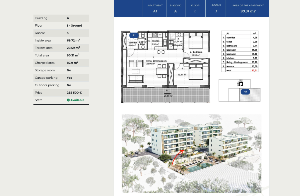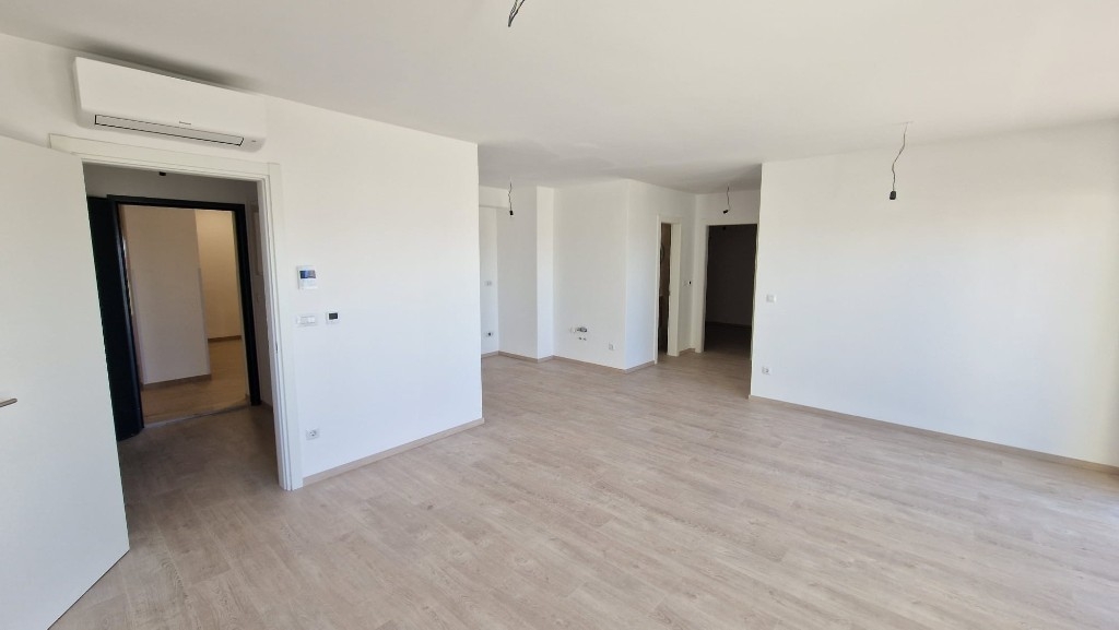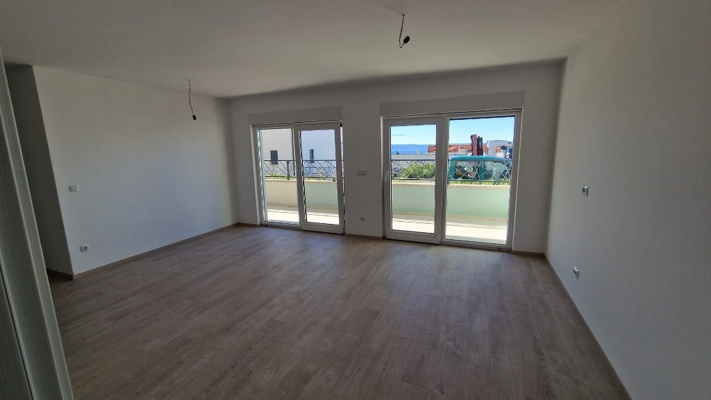 Makarska U ponudi je useljiv, moderan dvosoban stan površine 87,90 m², smješten u kvalitetnoj novogradnji na zapadnom dijelu Makarske, svega 850 metara udaljen od prekrasne plaže. Stan se nalazi na prizemlju zgrade s liftom i pruža otvoren pogled na more. Sastoji se od prostranog dnevnog boravka s kuhinjom i blagovaonicom, dvije udobne spavaće sobe, kupaonice, wc-a te lođe. Sve prostorije su klimatizirane, a zgrada je izgrađena od najkvalitetnijih materijala, pružajući visoku razinu udobnosti i dugotrajnosti. Stan dolazi s velikim garažnim parkirnim mjestom površine 16,45 m², a stanari na raspolaganju imaju i prostrani zajednički bazen – idealan za opuštanje i uživanje u ljetnim danima. Nekretnina se prodaje putem pravne osobe (stan je na firmi), što znači da kupac ne plaća porez na promet nekretnina.