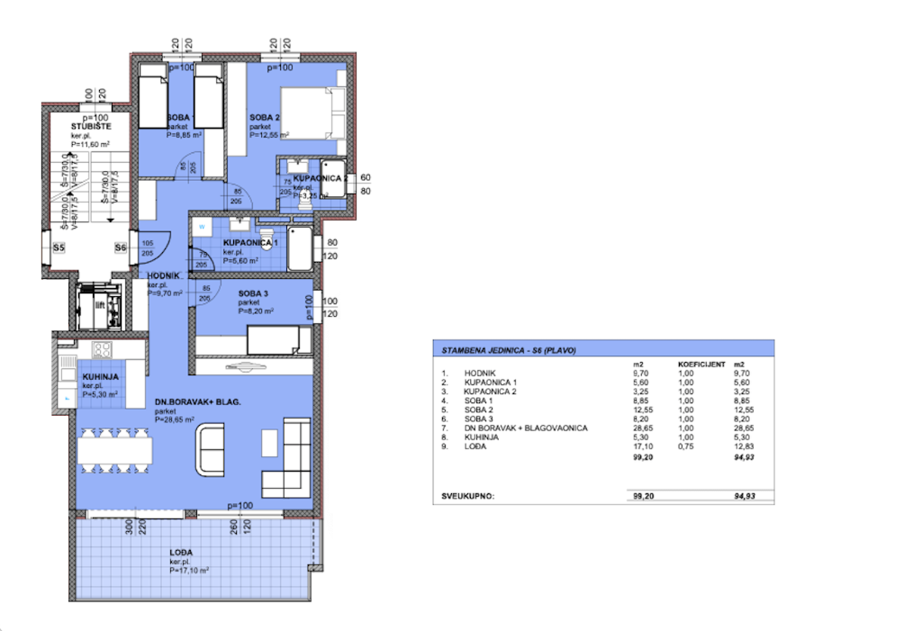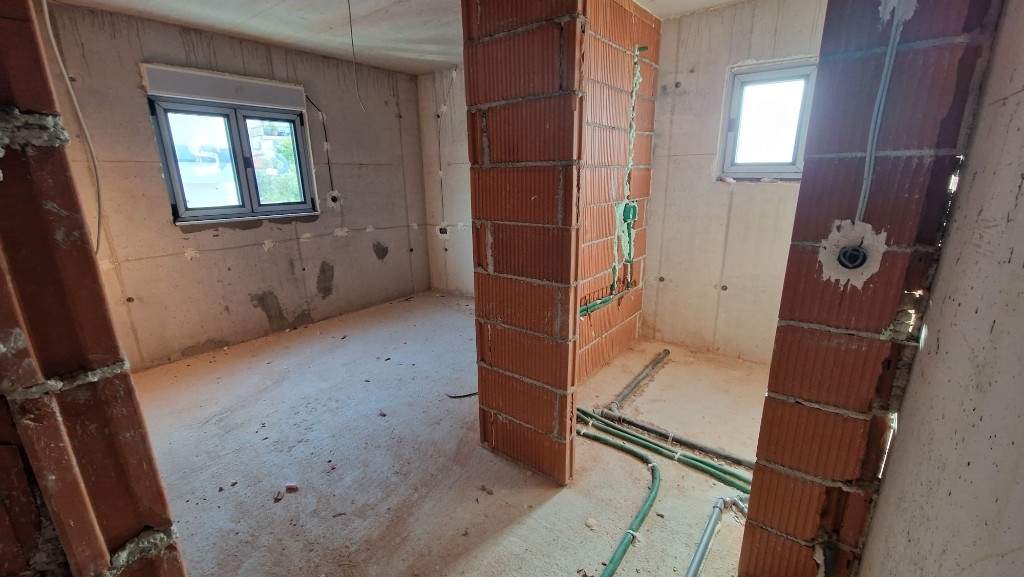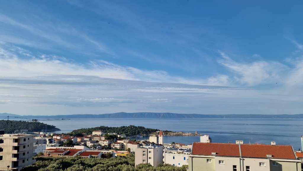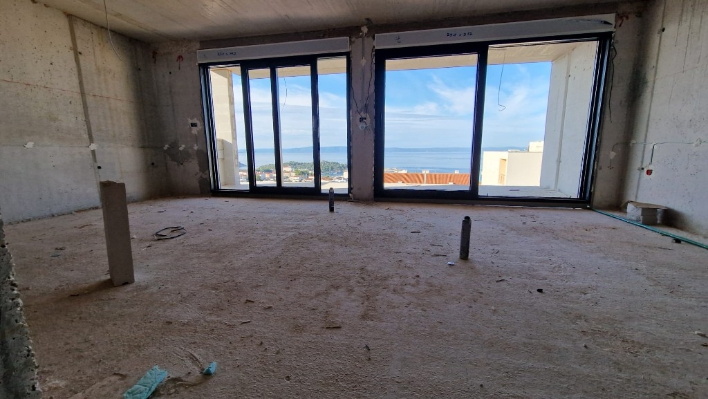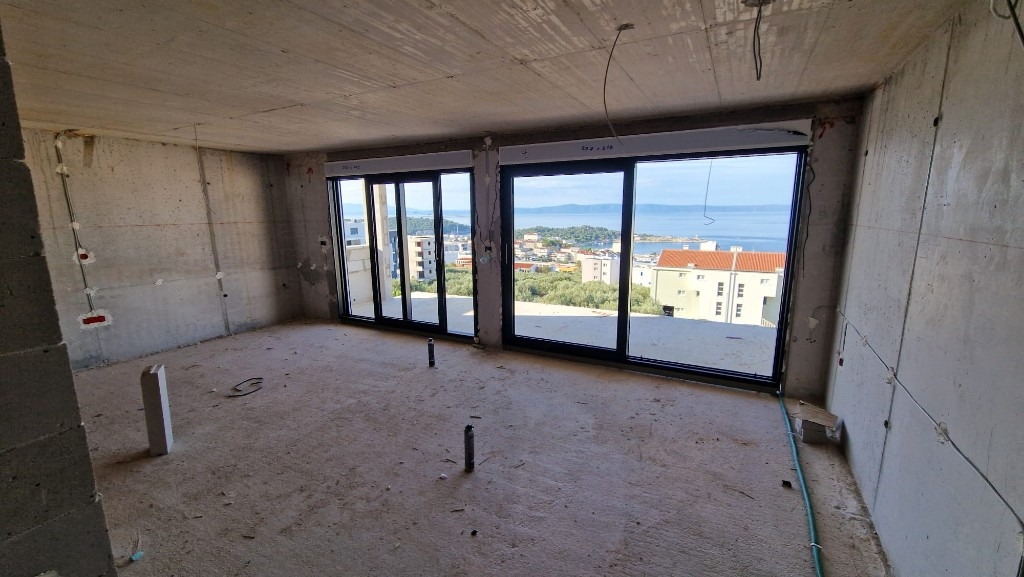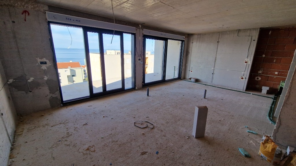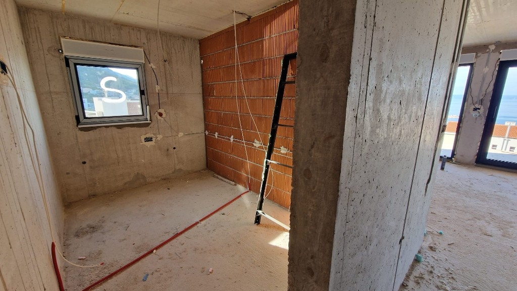 Na prodaju je trosoban stan u izgradnji, ukupne površine 94,93 m², smješten na drugom katu (visina trećeg kata) moderne zgrade s liftom. Posebnu vrijednost ovom stanu daje velika južno orijentirana terasa od 17,10 m² s otvorenim i trajnim pogledom na more, koji je zaštićen važećim prostornim planom.
