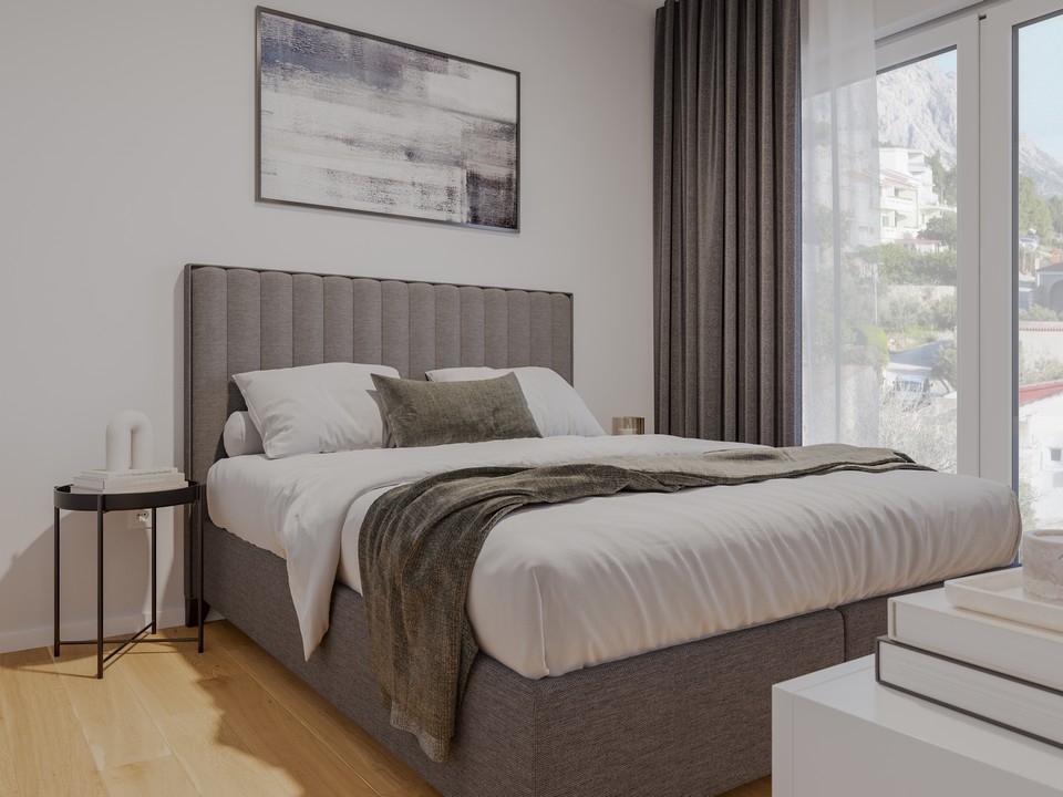 Zgrada s 12 elegantnih stanova raspoređenih na 4 etaže nudi potpuni komfor – od podzemne garaže s dizalom do prostranih terasa i balkona s panoramskim pogledom na Biokovo i Jadransko more.